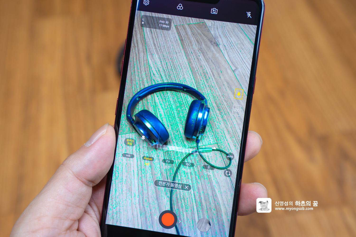 '전문가 사진' 모드를 선택하면 위와 같이 WB(화이트 밸런드), Focus(거리 조정), ISO(감도), S(셔터 스피드) 등을 수동으로 설정하여 사진을 촬영할 수 있다.