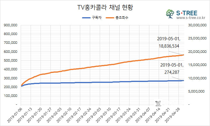 S-Tree(에스트리, 바로가기) 유튜브 DB를 활용해서 TV홍카콜라 구독자와 총 조회수 추이를 살펴보았다. 초반 이슈를 끌었던 만큼 구독자가 증가하지 않고 정체가 되어 있다는 것을 알 수 있다. 이대로라면 구독자 30만을 넘기기엔 쉽지 않을 것으로 보인다.