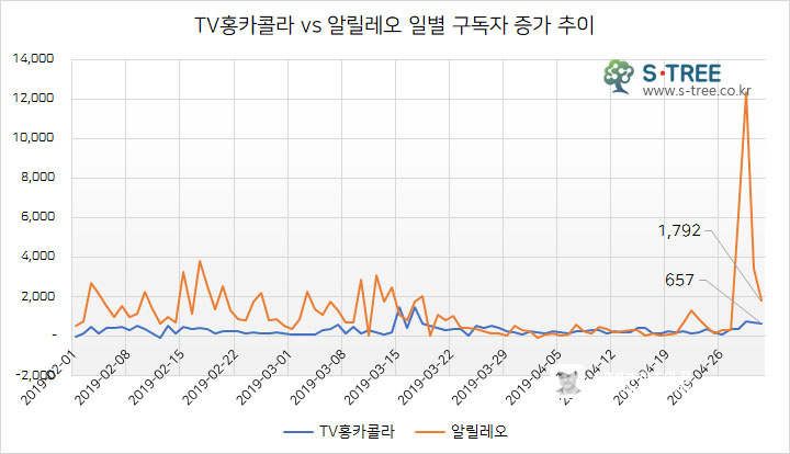 TV홍카콜라와 알릴레오 유튜브 채널의 일별 조회수 증가와 구독자 증가 추이를 살펴 보았다. 역시나 대부분의 날짜에서 알릴레오 채널이 TV홍카콜라를 2배 이상 크게 증가하고 있다는 것을 알 수 있다.