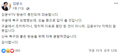 정치인 김문수 전 지사 유튜브 채널 삭제??