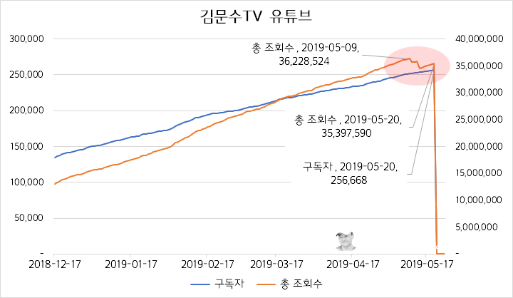 김문수TV는 에스트리 모니터링 데이터로 보면 2018/12/17 이후 지속적으로 성장해 구독자 25만명을 돌파하고, 2019/5/21 운영 정지가 된다. 김문수 전 지사도 운영상의 문제라 밝히기도 했고 이후 삭제되고 만다.