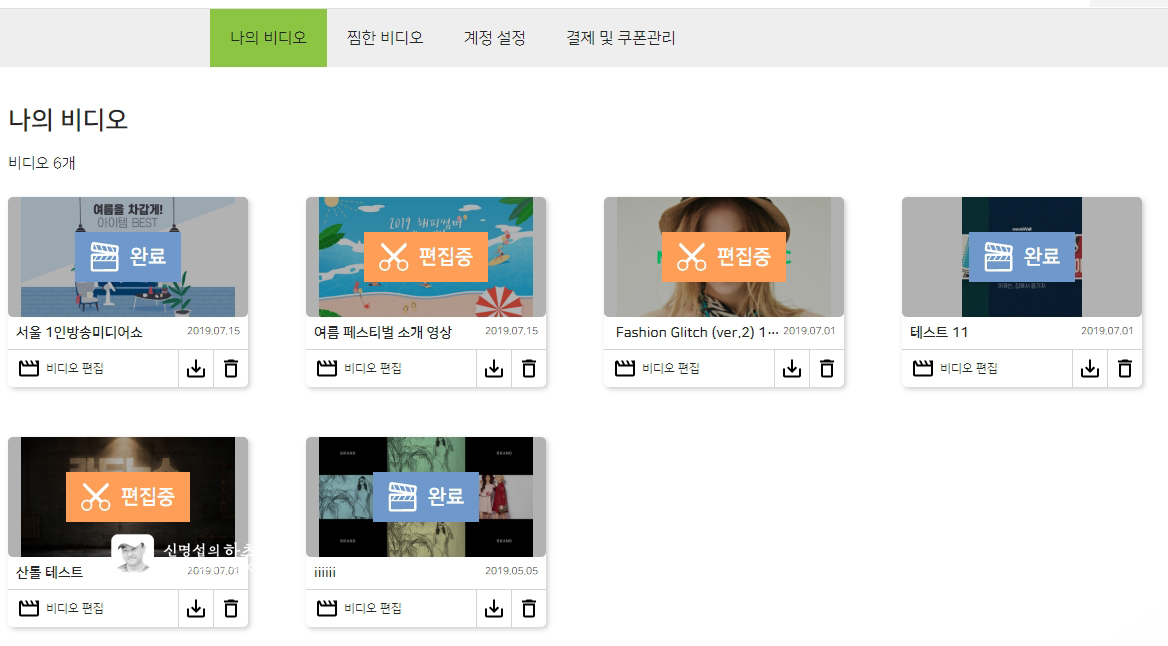 이렇게 비디오 템플릿의 씬 별로 텍스트와 사진/비디오를 선택하면 모든 작업은 완료된다. 작업을 완료한 후에는 [나의 비디오]로 이동하게 되고, 잠깐의 시간동안 렌더링 후 [완료]가 표시되면 완성된 영상을 플레이하거나 다운로드할 수 있다.