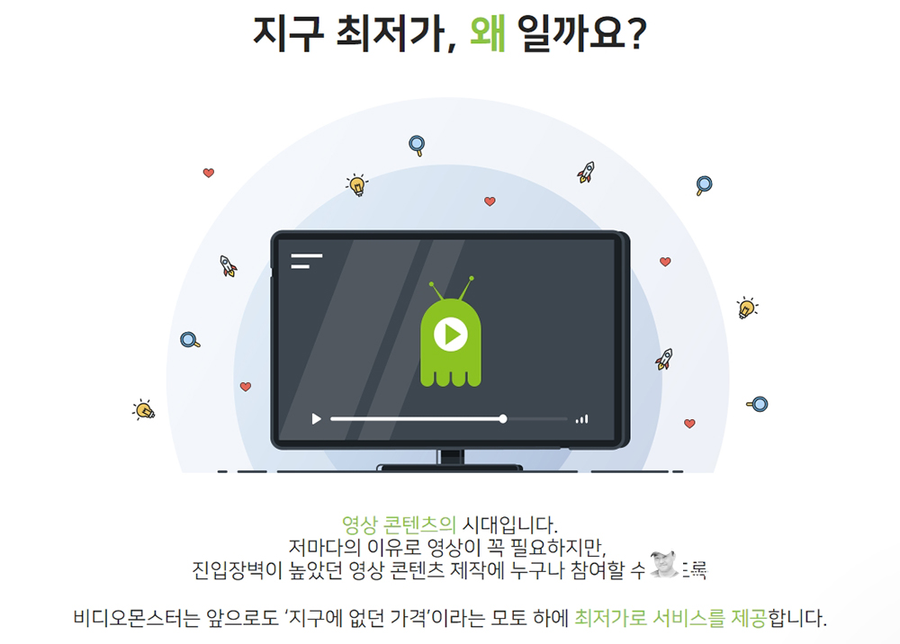 비디오몬스터는 비영일 단체 및 공익 단체에는 무료 영상 제작을 지원하고 있다. 스타트업 임에도 초기부터 사회 공헌에 관심을 가지고 있다는 것이 아름답다. 필요한 경우 이메일이나 고객센터로 신청하면 된다.