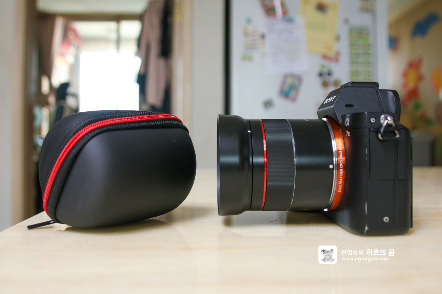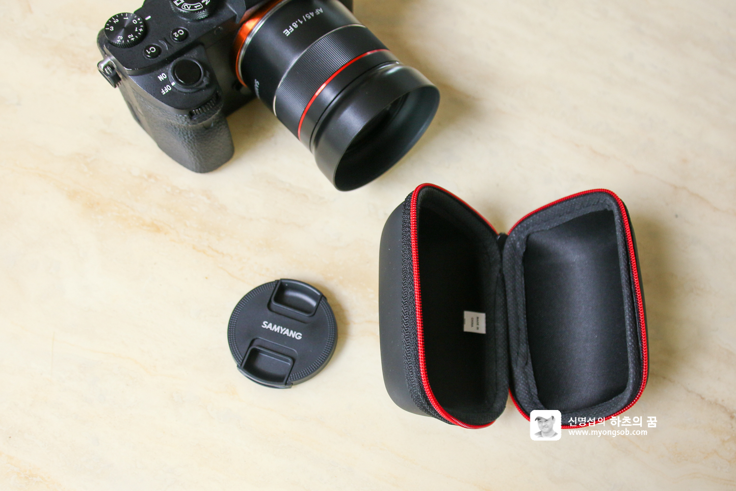 삼양 AF 45mm F1.8 FE 렌즈는 후드 및 하드 케이스가 기본 제공되어 보관이 편리하다.