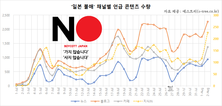일본이 경제 도발을 시작한 7월 1일부터 8월 2일까지 '일본+불매'을 언급한 채널별 추이를 살펴보았다. 체감으로 알 수 있듯이 상당한 언급량을 보이고 있다.