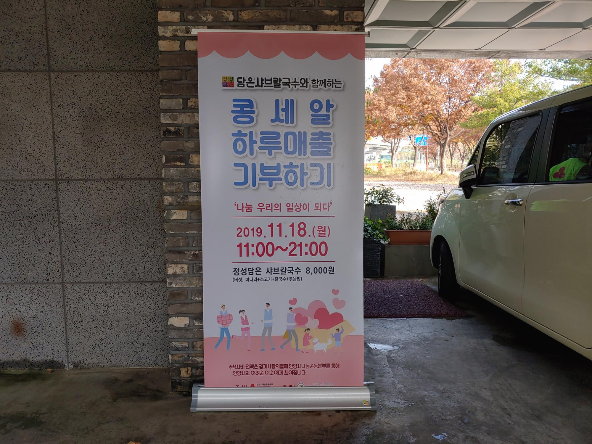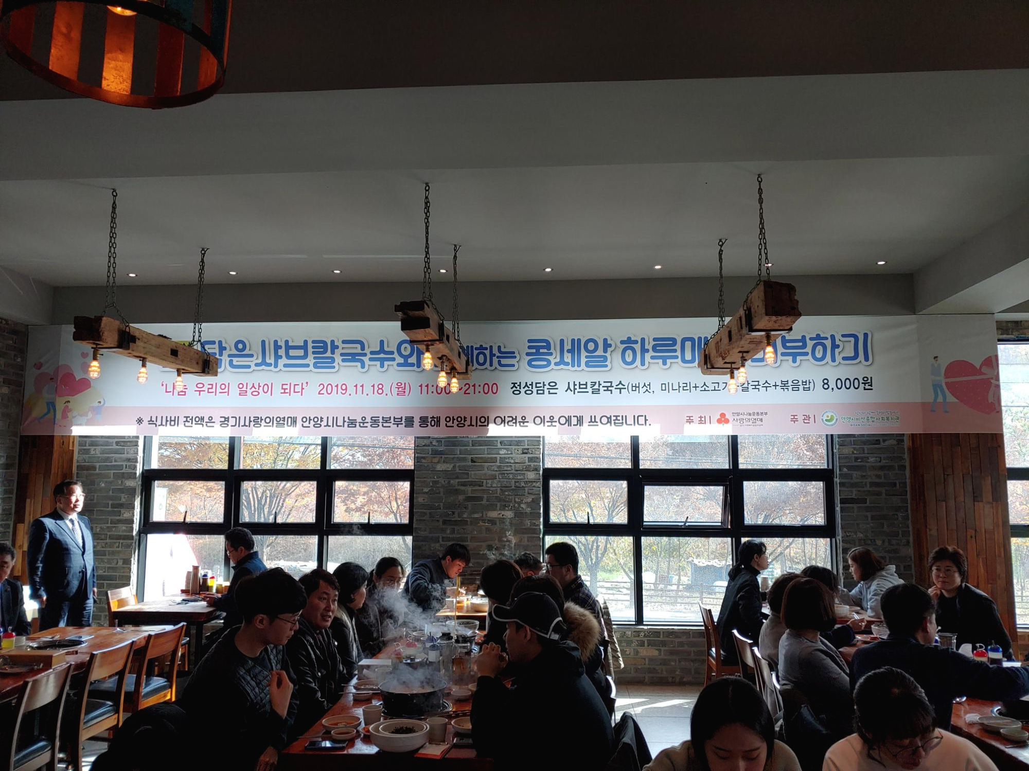안양시나눔운동본부의 '콩세알' 나눔 운동에 안양예술공원 맛집으로 유명한 '정상담은샤브칼국수' 가게가 참여해서 하루 매출을 기부하는 행사를 가졌다.