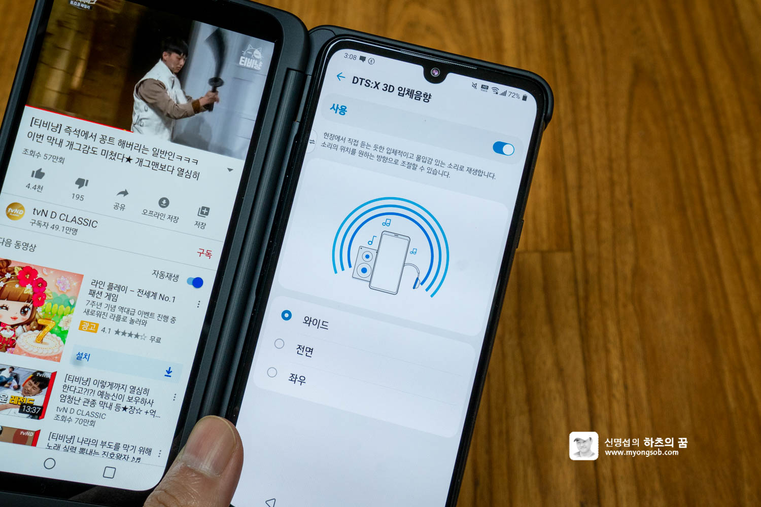 유튜브 등 영상을 보다가 사운드 설정을 한다는 것은 생각해 본 적이 없다. 하지만 LG V50s ThinQ은 듀얼 스크린이 있어서 다른 스크린에 사운드 설정을 켜서 영상을 보면서 사운드를 최적화시킬 수가 있다. 일반 영상을 보다가 뮤직비디오 등 멋진 사운드가 필요할 때는 그에 맞는 사운드로 바로 변경이 가능하다.