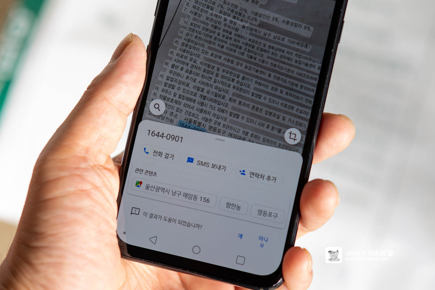 구글 렌즈도 카메라에 적용되어 정보가 있는 사진에 비추면 실시간으로 피사체 내에 있는 텍스트를 분석하여 정보를 추출해 낸다. 위 사진을 보면 문장 내에 있는 전화번호와 주소 등을 찾아내어 필요한 앱으로 연결시켜주는 것을 볼 수 있다.