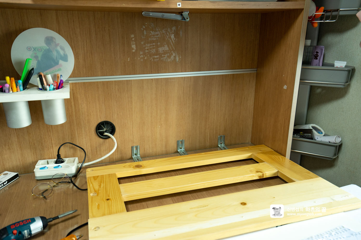 또한, ㄱ자 코너철을 고정할 때, 상단 고정 쇠를 장착할 때도 전동 드라이버로 손쉽게 작업할 수 있었다. 전동 드라이버가 없어도 책상에 나사 박는 것은 그리 어렵지 않다.