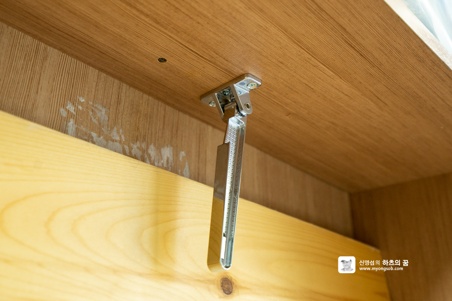 한쪽에 고정하고 180도 앞뒤로 열리는 것을 방향을 바꿔서 상단에 고정하고 좌우로 열리게 하면, 나무판을 올렸을 때 고정할 수 있을 것이라 생각한 것이다.