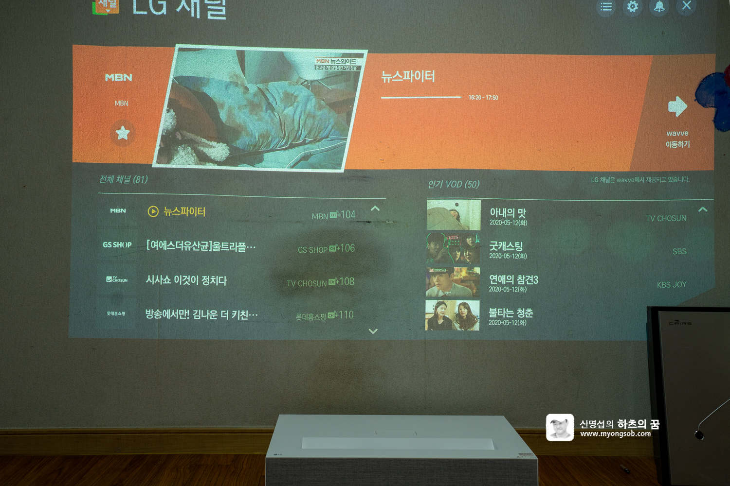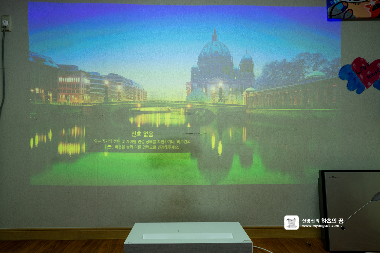 낮에 커튼을 치지 않고 영상을 보는 화면이다. 화면이 켜지는 순간 벽면 전체를 뒤덮는 영상의 크기에 놀라고 말았다. 대화면이라는 것은 알았지만 이렇게 큰 화면이 나올 줄은 몰랐다.
