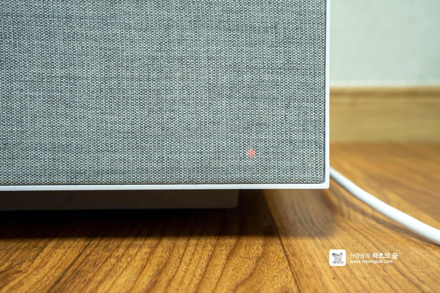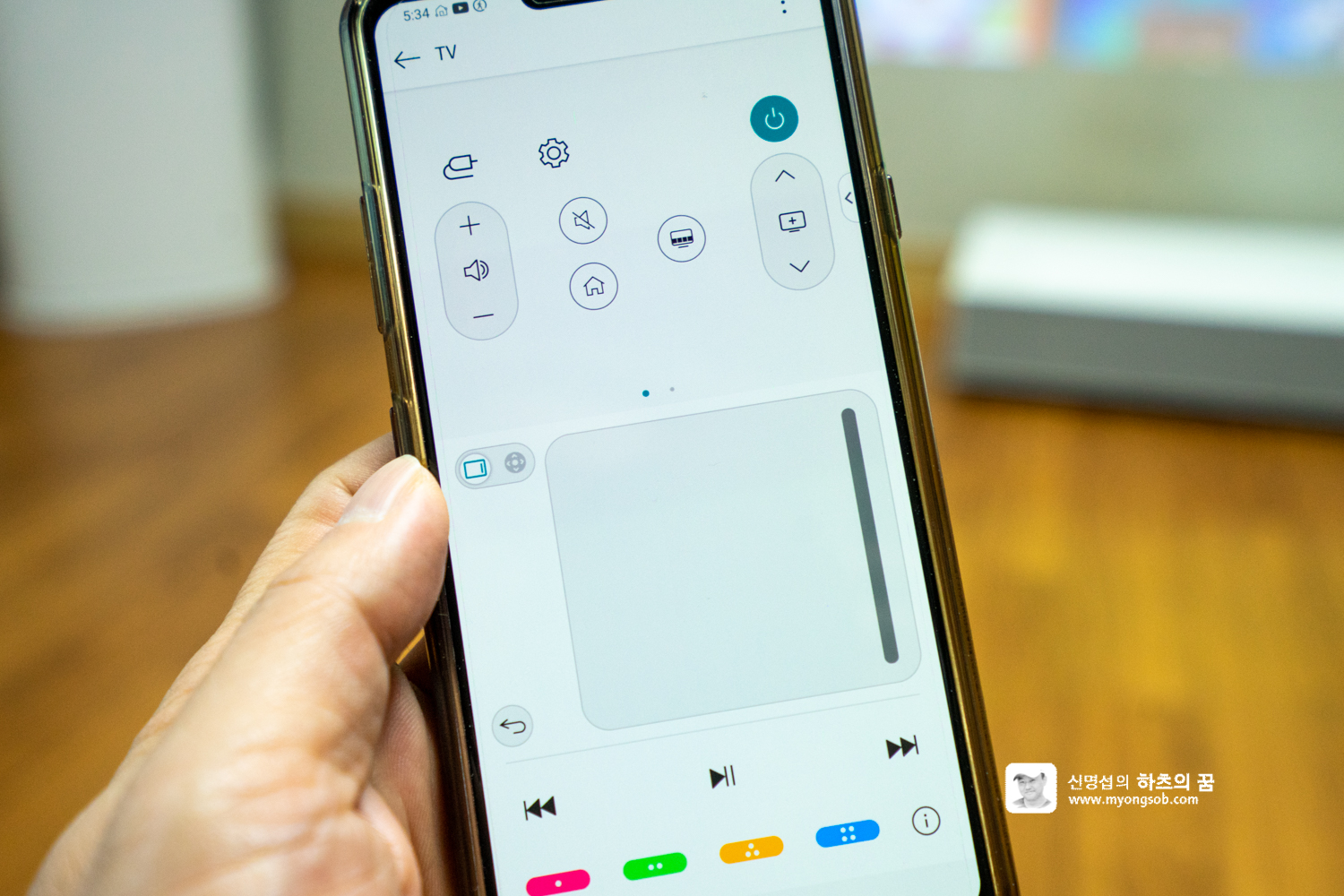 리모콘이 없는 경우에는 본체 오른쪽 하단의 컨트롤 버튼을 이용하면 여러 기능을 컨트롤 할 수 있다. 전원을 켜고 끌 수 있고, 상하좌우 밀고 눌러서 조정한다.