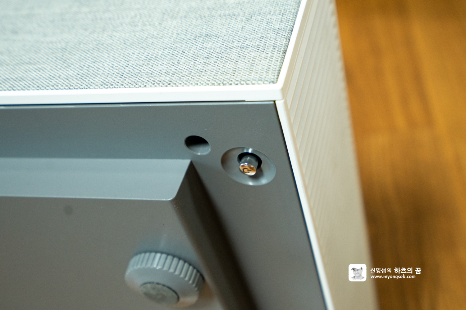 리모콘이 없는 경우에는 본체 오른쪽 하단의 컨트롤 버튼을 이용하면 여러 기능을 컨트롤 할 수 있다. 전원을 켜고 끌 수 있고, 상하좌우 밀고 눌러서 조정한다.