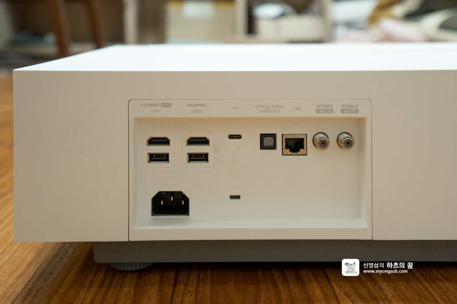 빔프로젝터 뒷면에는 HDMI 단자 2개, USB 단자 2개, USB Type-C 1개, Optical Digital Audio Out 1개, LAN 1개, TV 안테나 단자 등이 배치되어 있다.