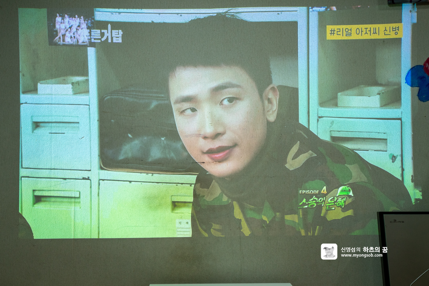 낮에 커튼을 치지 않고 영상을 보는 화면이다. 화면이 켜지는 순간 벽면 전체를 뒤덮는 영상의 크기에 놀라고 말았다. 대화면이라는 것은 알았지만 이렇게 큰 화면이 나올 줄은 몰랐다.