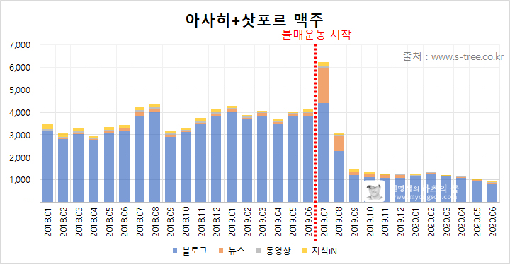 불매운동을 시작하면서 편의점에서 맥주가 사라지면서 아예 구매하기가 힘들어졌다. 그리고는 언급량이 급감하면서 약 70%가 사라졌다. 뉴스 기사가 일본 맥주의 동향을 보도하는 것이 거의 대부분이라고 할 정도로 블로그와 지식인 등에서 언급이 사라졌다. 어느 분야보다 빠르게 잊혀져 가고 있다.