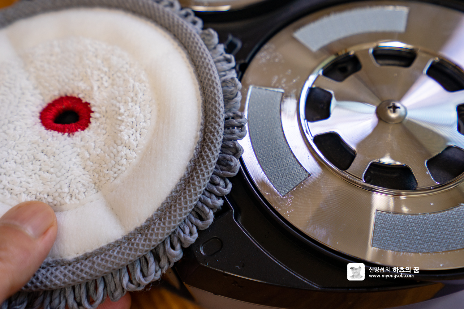 LG M9 로봇청소기 하단부의 원판은 일명 찍찍이라 부르는 벨크로 타입으로 되어 있어서, 걸레를 가져다대면 쉽게 달라 붙는다. 두개의 물걸레를 부착할 때 서로 겹치지 만 않게 하면 청소 운행에는 문제가 없다.