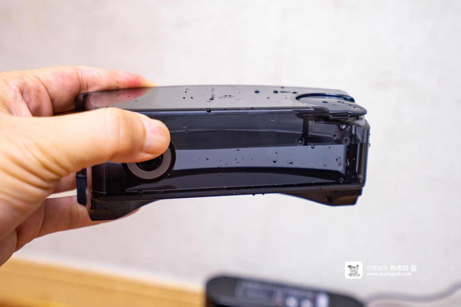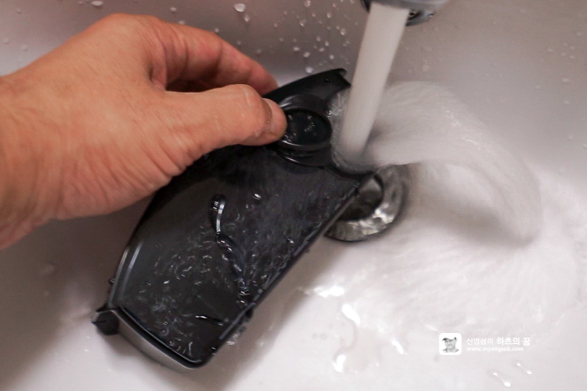 LG M9 뒷부분에 300ml 대용량 물통이 내장되어 있다. 손으로 가볍게 빼낼 수 있으며, 뚜껑을 열고 물을 80%가량 채우고 다시 부착하면 된다.