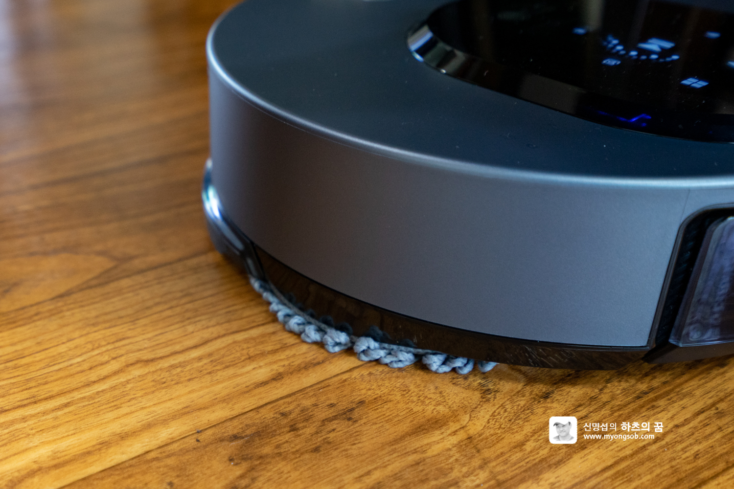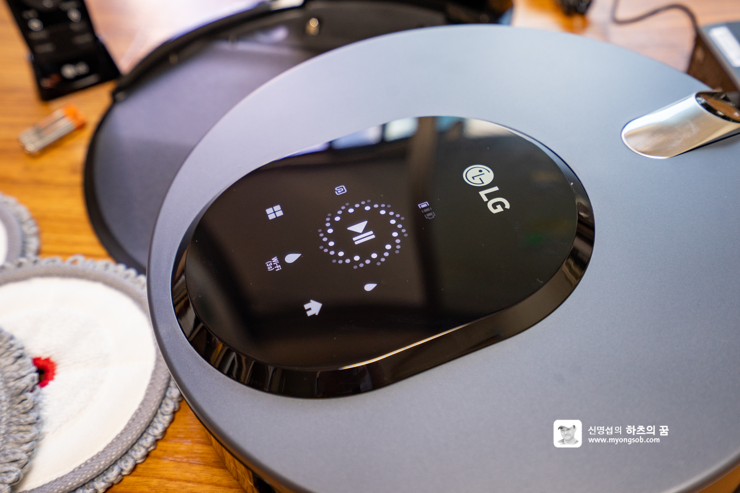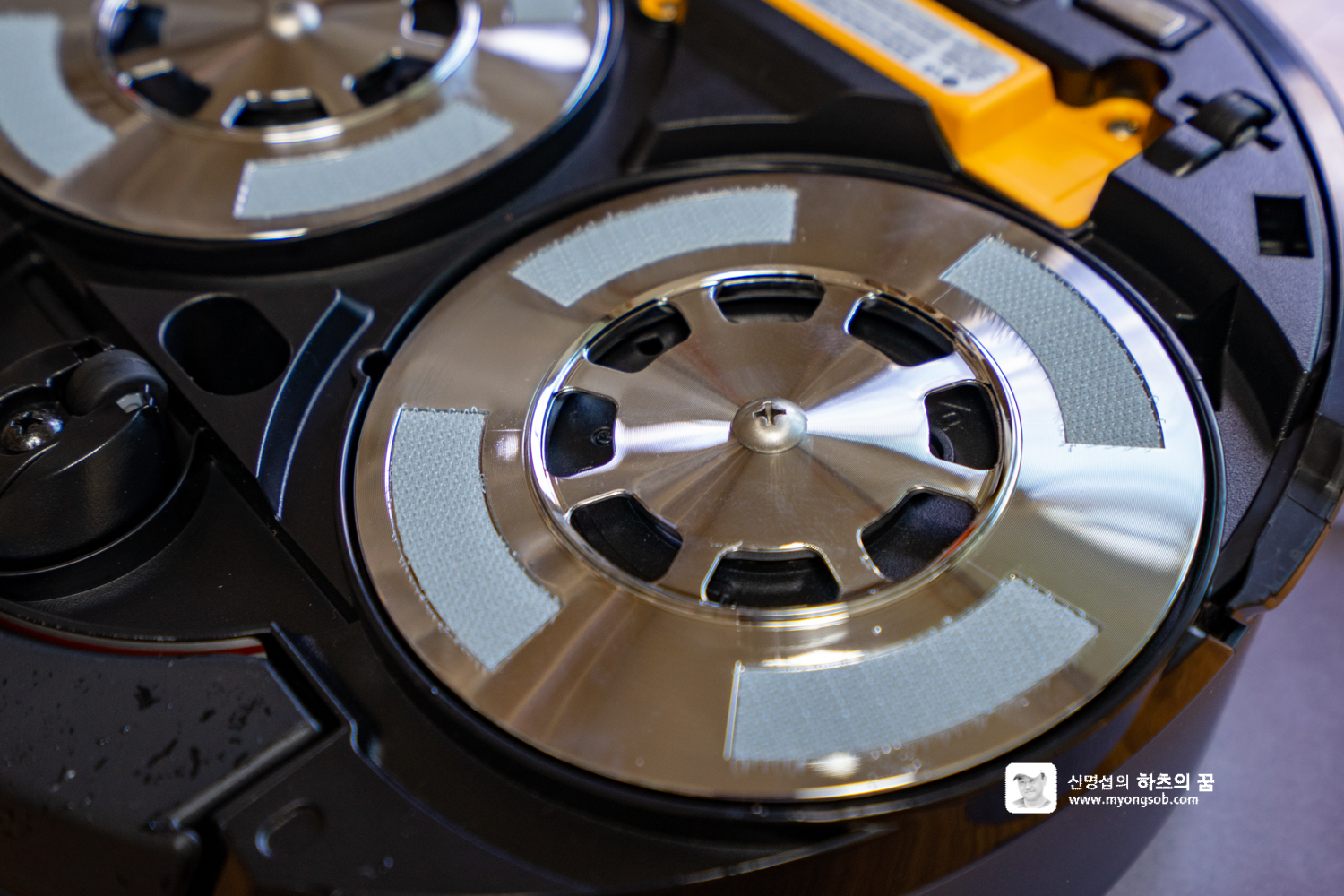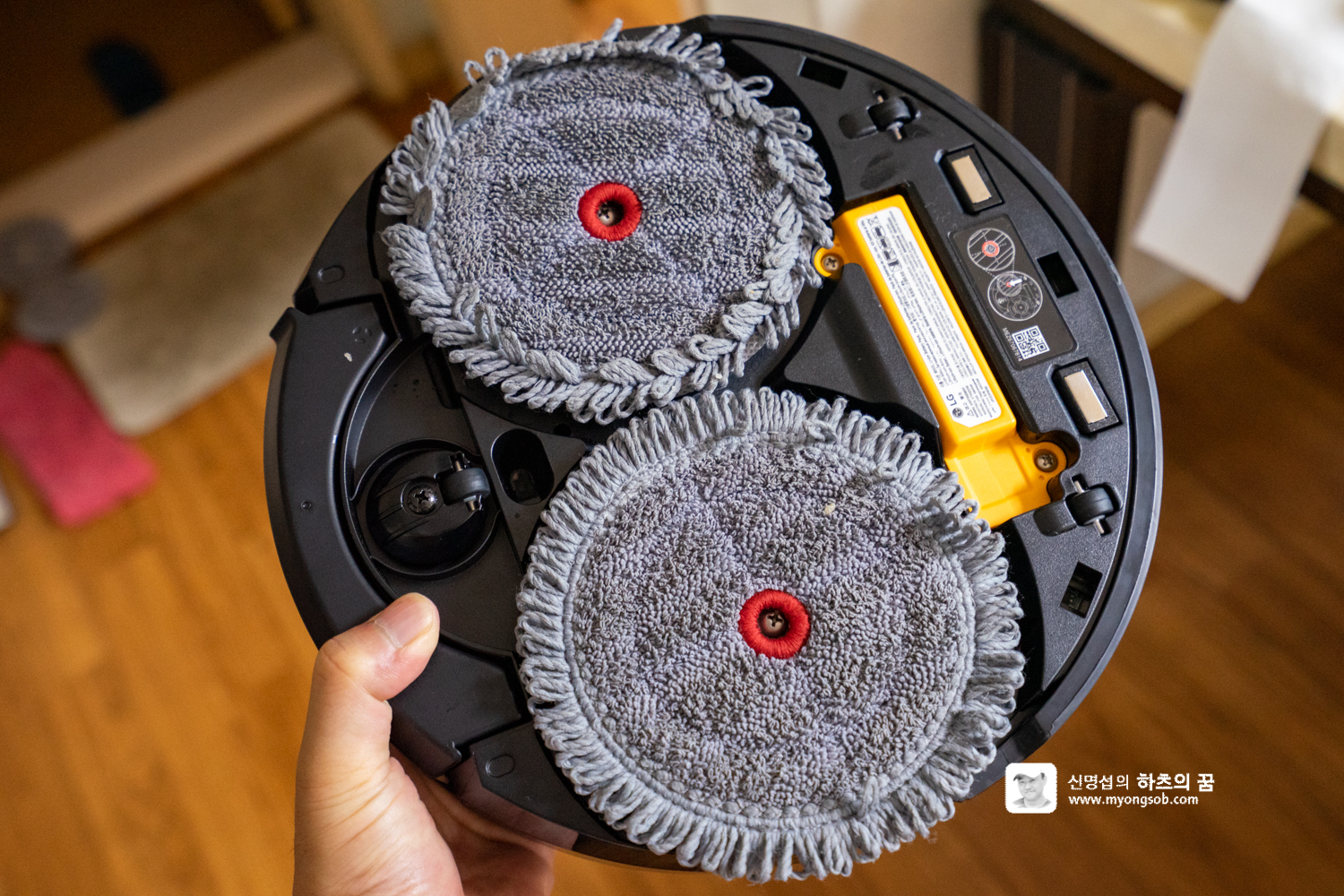 LG M9 로봇청소기 하단부의 원판은 일명 찍찍이라 부르는 벨크로 타입으로 되어 있어서, 걸레를 가져다대면 쉽게 달라 붙는다. 두개의 물걸레를 부착할 때 서로 겹치지 만 않게 하면 청소 운행에는 문제가 없다.