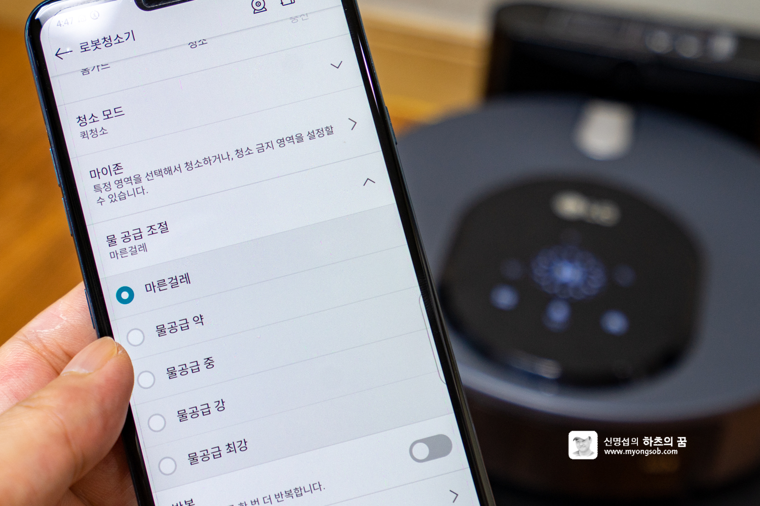 청소할 때 물걸레가 마르지 않도록 자동으로 물을 급수한다. 이때 공급하는 물의 양은 5단계로 조절할 수 있다. 중과 최강은 앱으로 만 조절할 수 있다.