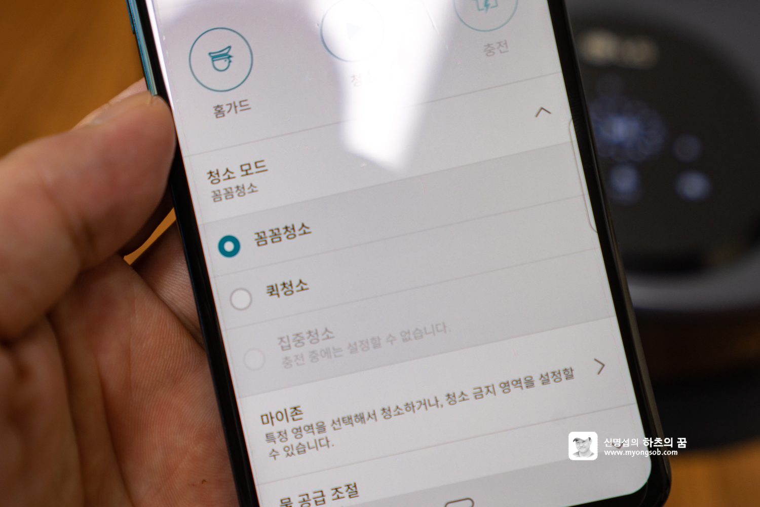 앱 연동 후 로봇청소기 메뉴에 들어가면 위와 같이 다양한 기능을 제어할 수 있다. 바로 청소를 시작할 수 있고, 꼼꼼청소/퀵청소/집중청소 등 청소 모드를 선택할 수 있고, 집안 구조를 인식한 경우에는 마이존을 설정하여 청소를 선택적으로 시킬 수도 있다.