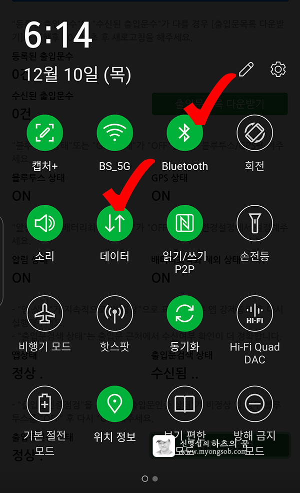 AI 패스 기능을 사용하려면 스마트폰의 블루투스 및 데이터 기능을 활성화하여야 한다. 블루투스는 출입문과 통신하기 위한 기능이고, 데이터는 KT와 통신하여 인증을 하기 위함으로 보인다.