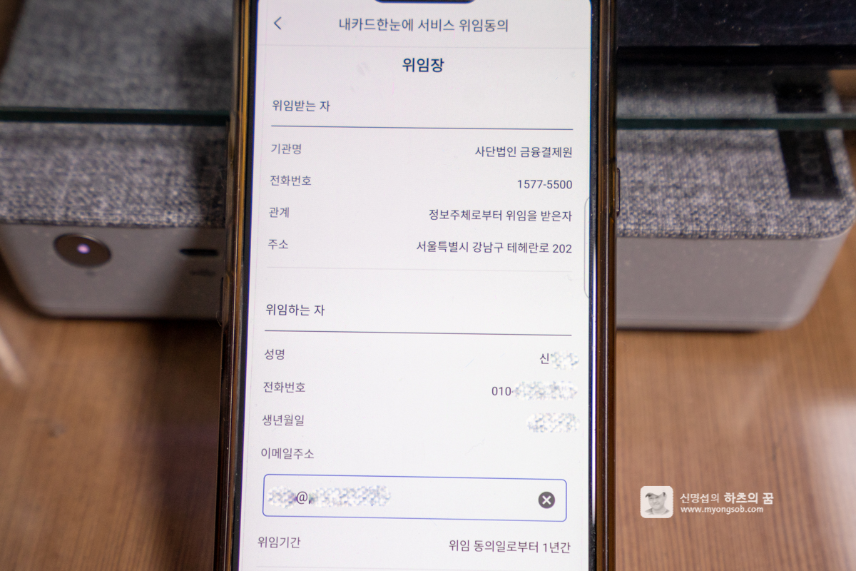카드 포인트 통합 조회를 들어가면 먼저 위임장 동의를 해야 한다. 동의일로부터 1년간 유지되며 원치 않을 때는 동의를 철회하는 기능도 제공한다.