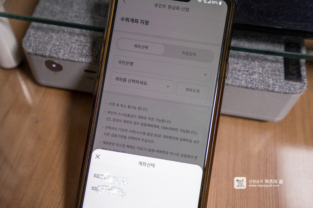 포인트를 현금으로 입금받을 은행 계좌를 선택한다. 직접입력을 선택하면 이체받을 은행을 수동으로 입력할 수 있다.