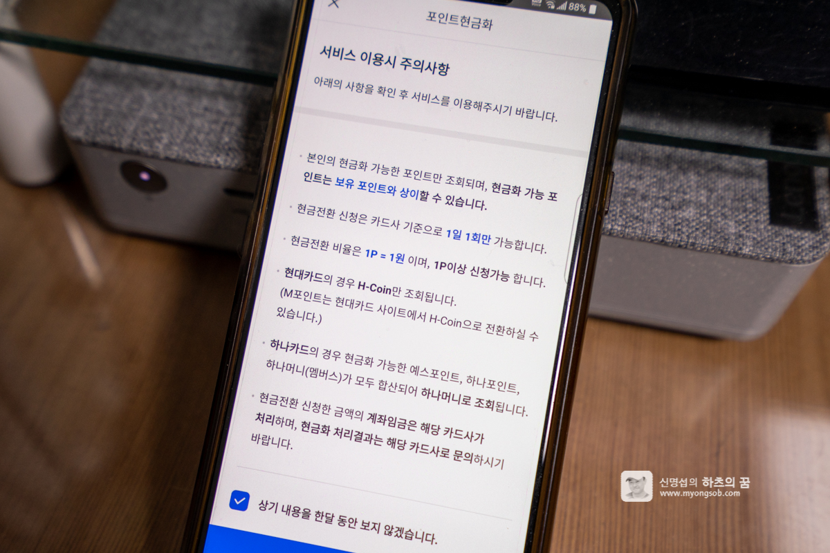 카드 화면의 '포인트 현금화' 메뉴를 누르면 위와 같이 안내 및 주의사항이 니타난다.