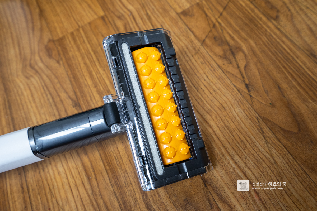 물걸레 흡입구 앞쪽 아래면을 보면 공기 흡입구가 있어서 이 공간을 통해 먼지를 먼저 흡입하고, 뒤 이어 물걸레가 물청소를 하게 된다. 두번의 청소를 한번에 할 수 있게 해주는 것이다.