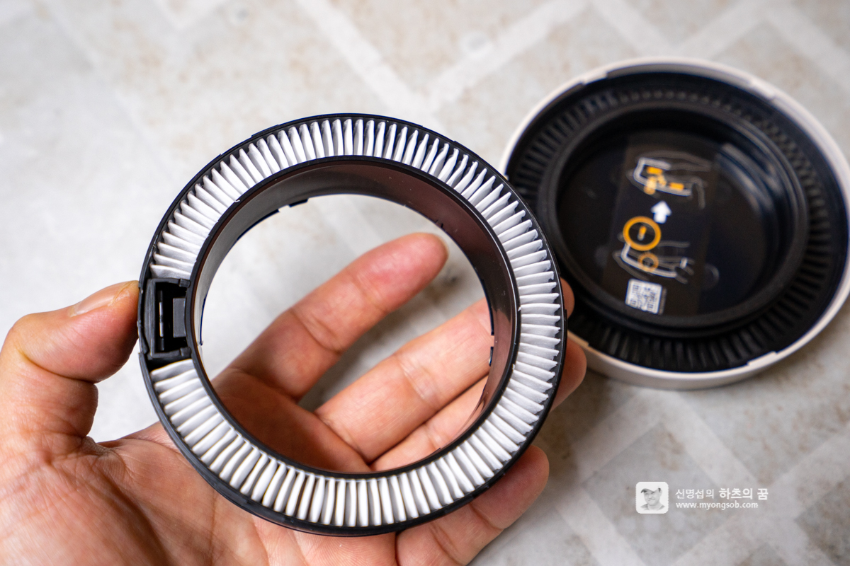물걸레 흡입구 앞쪽 아래면을 보면 공기 흡입구가 있어서 이 공간을 통해 먼지를 먼저 흡입하고, 뒤 이어 물걸레가 물청소를 하게 된다. 두번의 청소를 한번에 할 수 있게 해주는 것이다.