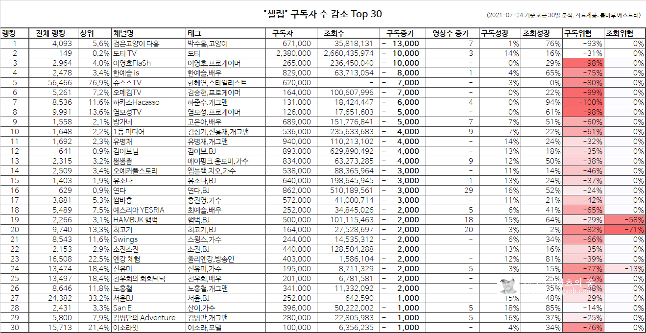 구독자가 감소하는 채널들도 다수 존재하다. 아래 순위는 단순히 구독자 감소 수량 만으로 본 자료다.