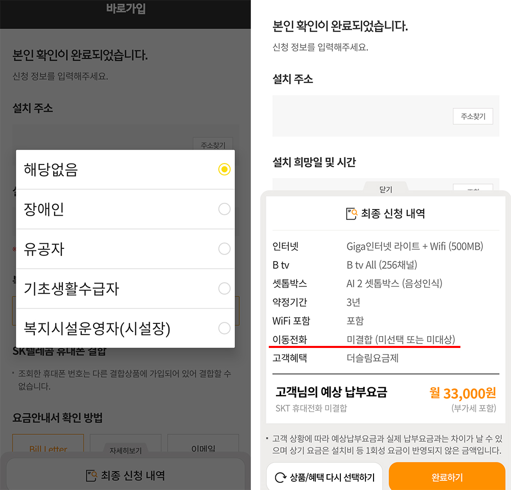 바로가입 신청 과정에 할인을 위한 선택 정보를 충실히 지원하고 있다. 만약 장애인/유공자/기초생활수급자 등에 해당된다면 이를 선택하고 필요한 서류를 제출하면 된다. 이런 과정은 대리점을 방문하거나 전화상담을 통해서 진행하던 과정인데, 그런 것 없이 인터넷 가입 과정에서 모두 진행할 수 있다.