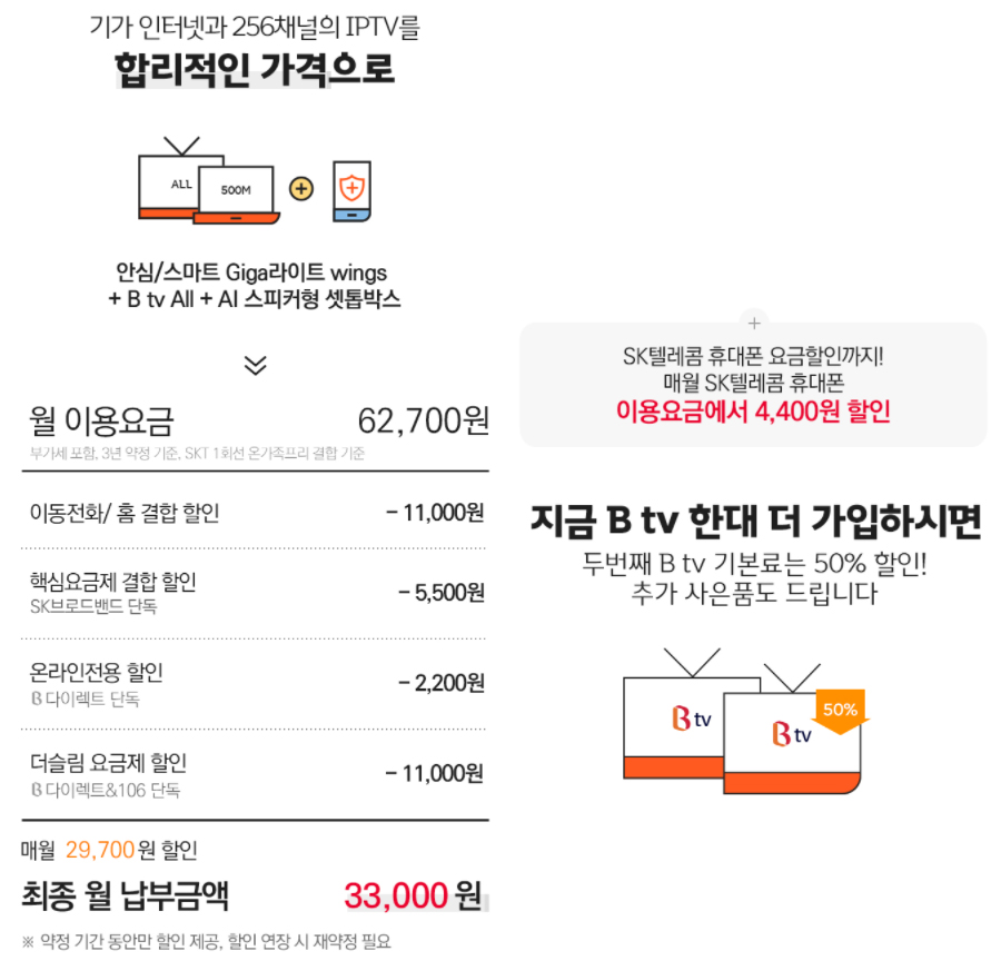 특히 휴대폰은 SK텔레콤을 이용하는 경우에 휴대폰 이용요금 4,400원 할인 까지 제공하고, B tv를 한대 더 이용하면 두번째 B tv는 기본료의 50%까지 할인을 받을 수 있다.