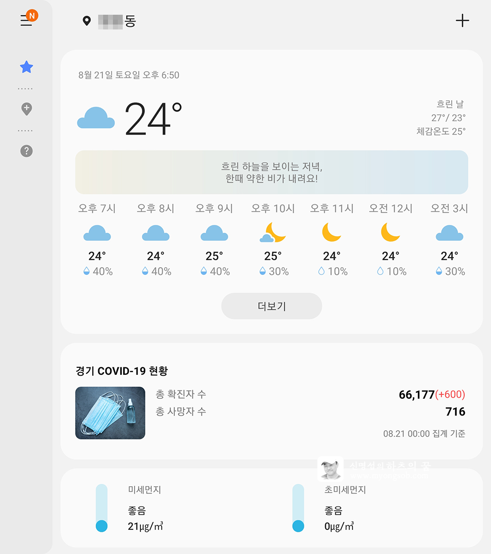 날씨 앱과 같이 '갤럭시 Z 폴드3'의 기본 앱들은 대체로 위와 같이 좌측에 메뉴를 노출하고 우측에 콘텐츠를 표시하는 형태로 구성되어 있고, 상황에 맞춰 편리하게 구성이 되어 있다.