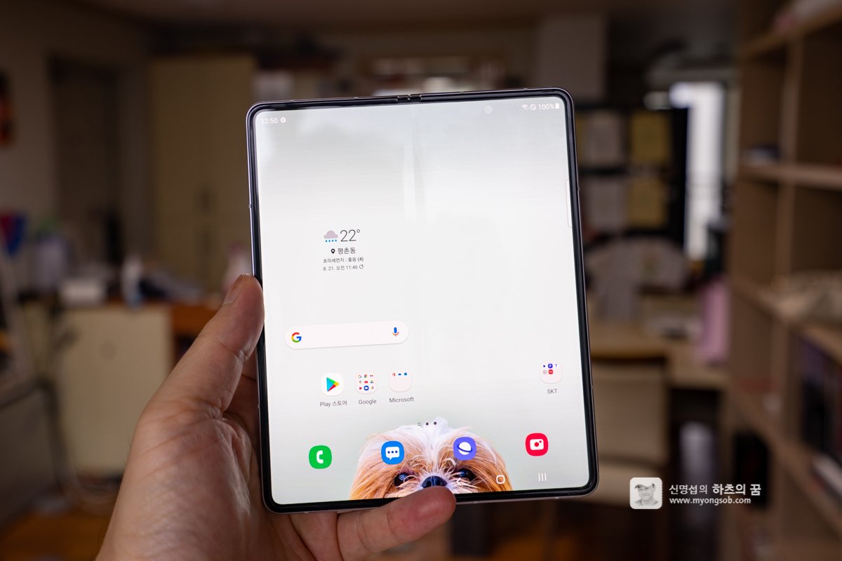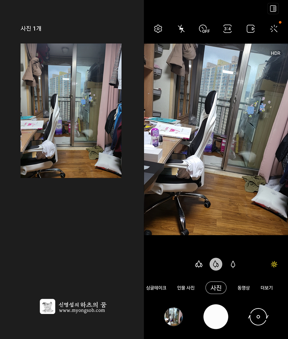 기본 앱인 '카메라'는 펼쳤을 때와 살짝 접었을 때 화면이 빠르게 전환되면서 위와 같은 구성을 제공한다. 카메라 앱을 시작하고 살짝 접으면 위와 같이 좌측에 촬영한 사진이 나타나고 바로 확인할 수 있게 해 준다.