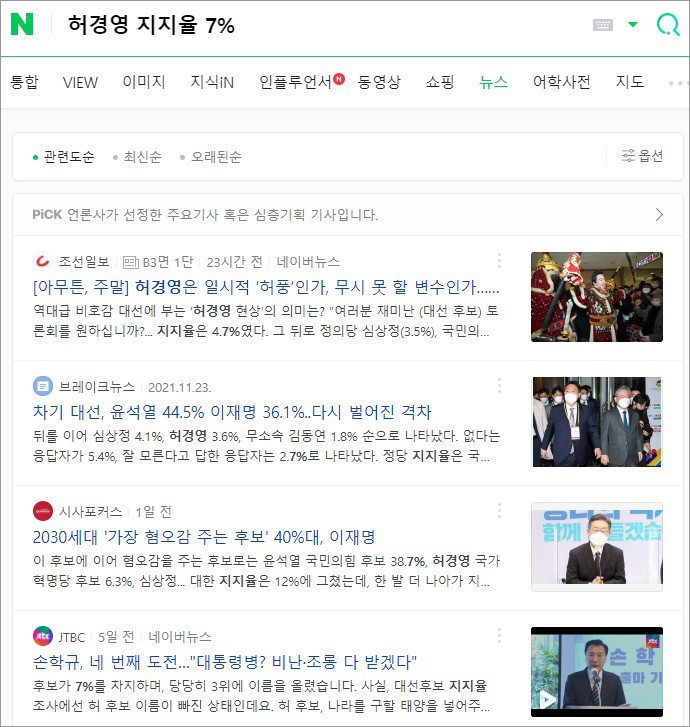 하지만, 최근 1개월 네이버 및 구글에서 '허경영 지지율 7%'를 검색했을 때 '허경영 관련 유튜브 채널 및 블로그'를 제외하고는 정보를 찾을 수 없었다. 하지만, 최근 허경영 지지율은 4.7%로 대선후보 중 3위를 차지했다는 기사는 찾을 수 있었다.