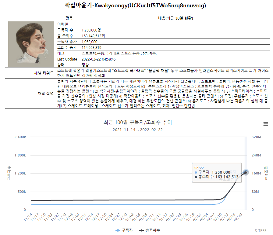 | 1 | 471 | 꽉잡아윤기-Kwakyoongy | 쇼트트랙,운동,국가대표,스포츠,운동,남성,예능, | 1,250,000 | 163,142,513 | 1,062,000 | 114,953,819 | 17 |