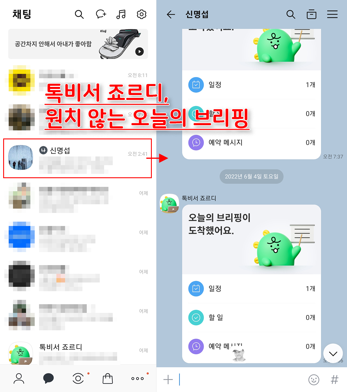 톡캘린더 활성화 위한 무리수, 톡비서 죠르디/오늘의 브리핑