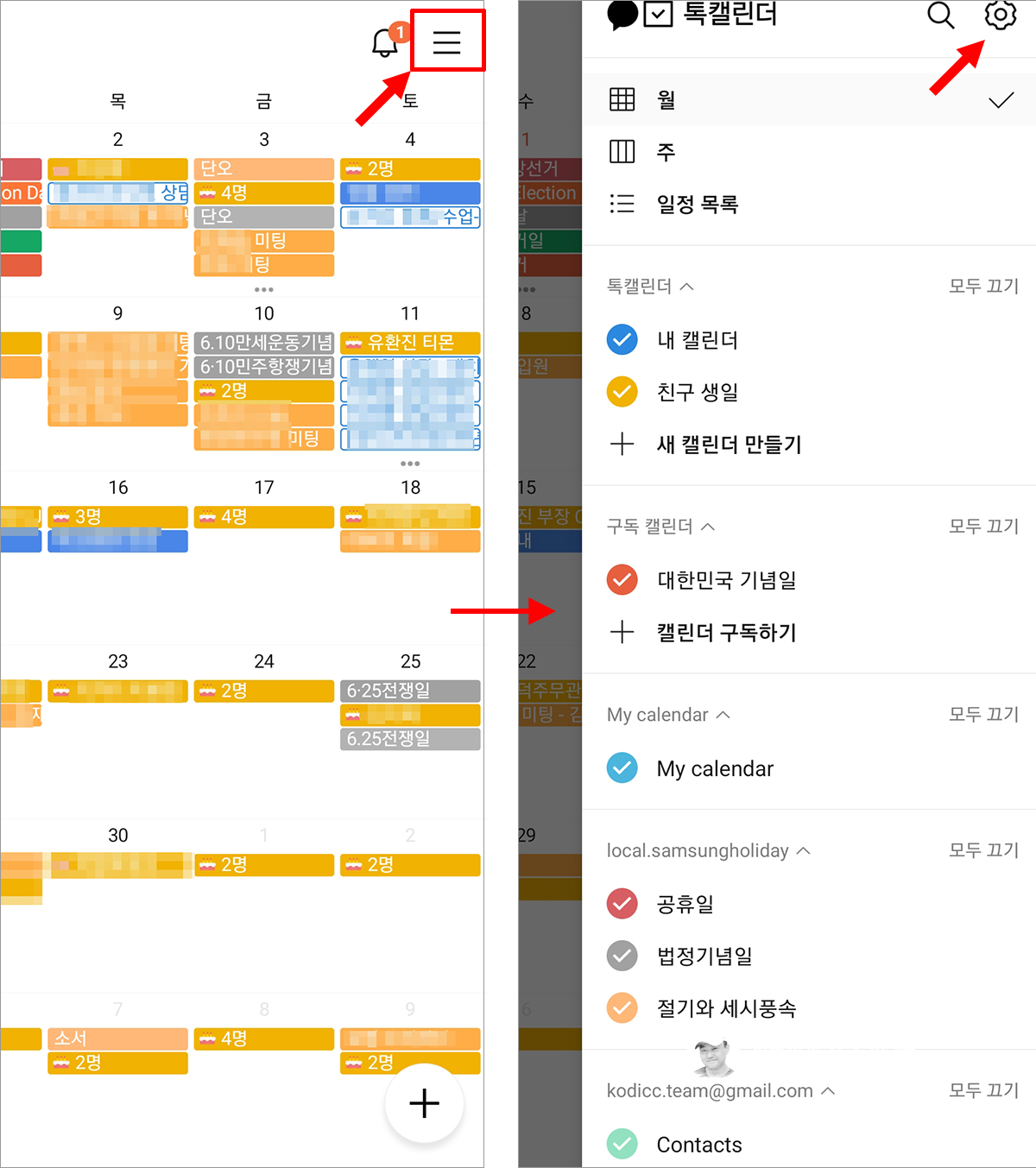 캘린더에 접속하면 그 동안 연동했던.. 구글, 연락처 등에 저장한 일정 및 국가지정일 등이 빼곡하게 나타난다. 여기에 더해 파란색 테두리로 디자인 된 톡캘린더 일정도 함께 나타난다.