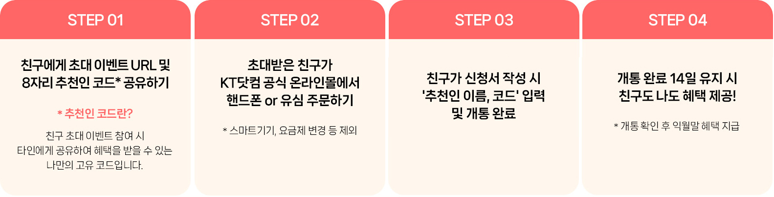 KT 스마트폰 가입자는 친구추천 코드를 발급 받고, 친구가 가입할 때 해당 코드를 넣고 가입하면 나와 친구 모두 네이버 페이 1만원을 받는 이벤트도 진행 중이다.