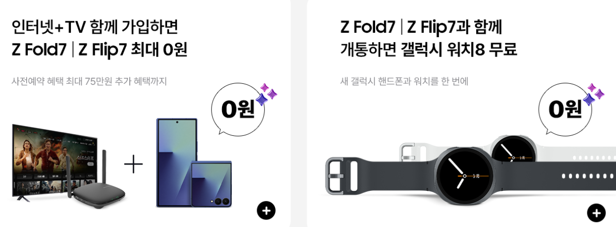 갤럭시 폴더블7과 갤럭시 워치8 시리즈를 동시에 가입할 경우 워치 할인을 받을 수 있다. (최대 39만 9천원 할인) - 인터넷 + TV 동시 가입 혜택