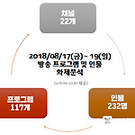 금토일 방송 프로그램 분석 랭킹 - 2018/08/17(금)~19(일) 시청량이 집중되고 그래서 방송사와 광고주가 가장 많은 관심을 가지는 요일인 '금/토/일요일'의 방송 프로그램 분석을 진행했다. S-Tree의 자료를 토대로 포털 화제 검색어와, 검색어가 등장한 이유인 이슈 연관어로 분석하였으며, 방송 채널, 방송 프로그램, 등장한 스타의 각 지수를 산출하여 연관도를 찾았다. (바로가기) 지난 8월 17일(금)~19일(일) 3일 동안 화제 검색어로 등장한 방송 프로그램은 총 117개이고, 이를 방송 채널 별로 보면 22개가 된다. 또한 화제 키워드로 등장한 인물(스타)는 232명이다. 화제가 되어 검색된 인물 대부분은 방송 프로그램에 등장하여 검색되었고, 조영남(그림대작 무죄), 윤정수(도촬 논란) 등..