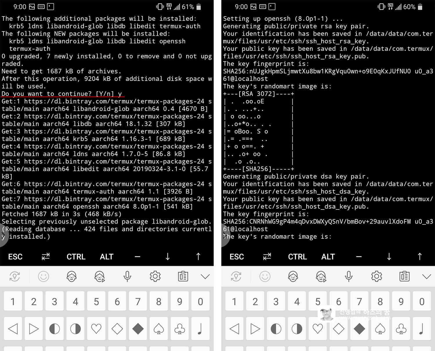 openssh를 설치하는 과정은 리눅스 머신에서 보는 것과 똑같다. 몇번의 질문이 있고 별 문제없이 설치가 안료되었다. 프로그램 설치 위치는 /data/data/com/termux/files/usr/etc/ 이다.