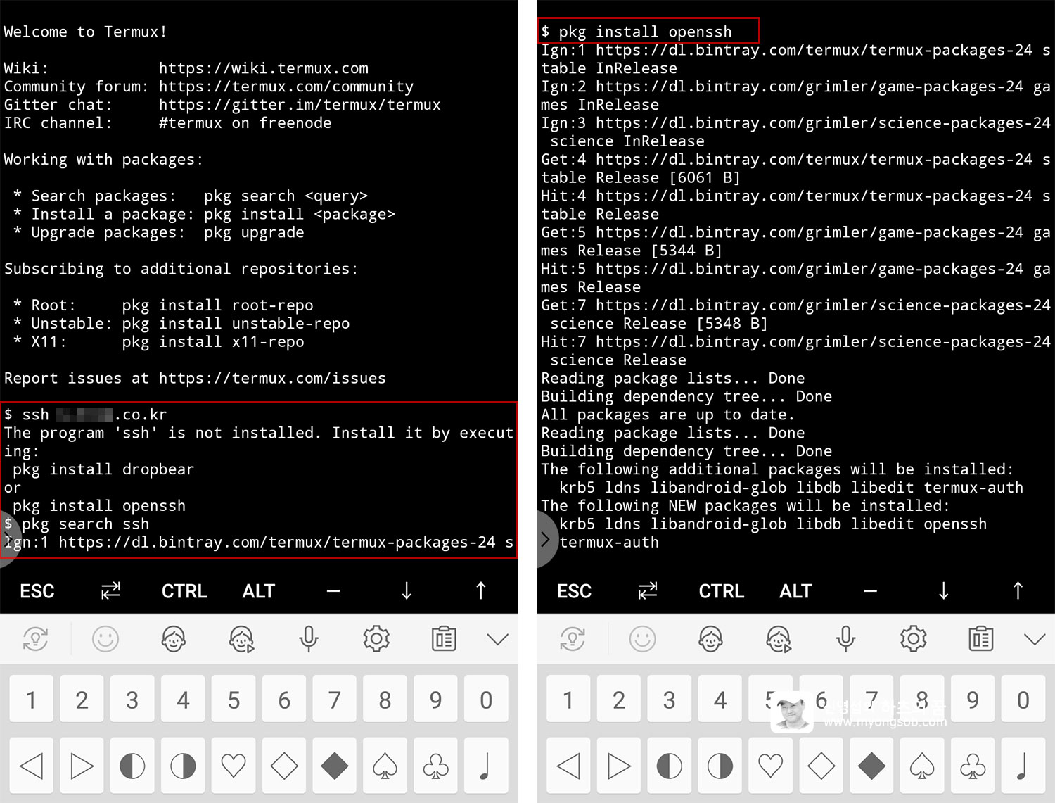 $ pkg search ssh 명령으로 보니 openssh가 검색된다. pkg install openssh 명령으로 SSH를 사용하기 위한 프로그램 openssh를 설치했다.