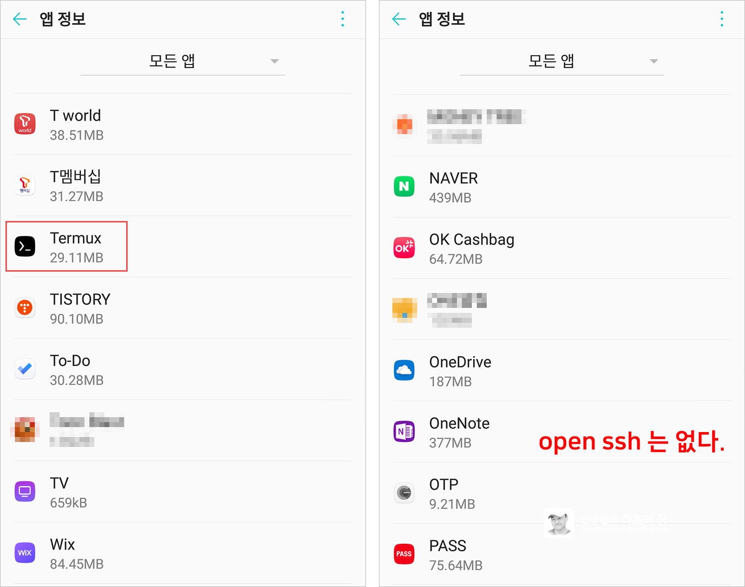 스마트폰에서 프로그램 설치 정보를 보면, Termux는 설치가 되어 있는 것을 확인할 수 있다. 하지만, Termux 의 쉘에서 설치한 openssh는 보이지 않는다.
