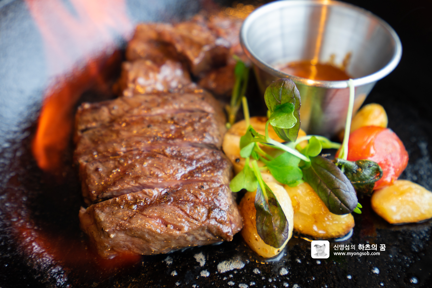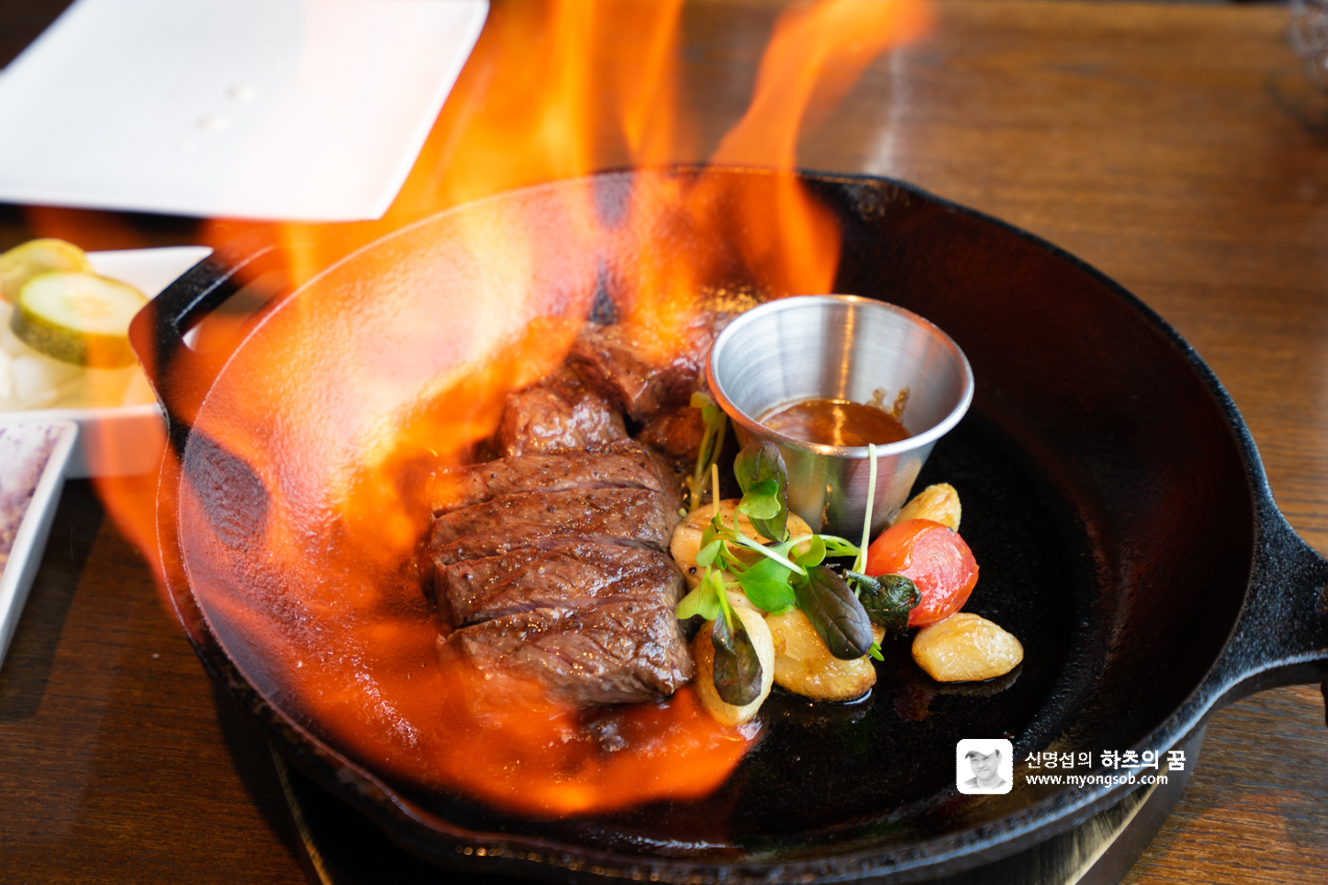 가든 샐러드와 파스타를 먹고나니 메인 메뉴인 살치살 스테이크가 나왔다. 식사 전에 잡내를 제거하기 위해서인지 불을 붙인다.