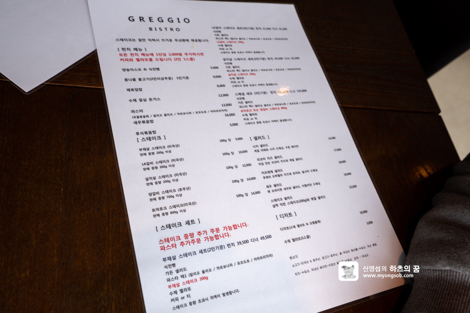2인 기준 부채살 스테이크 세트가 런치 39,500원, 디너 49,500원이다. 부드러운 부채살 스테이크와 가든 샐럳, 파스타, 수제 젤라또, 커피 등이 제공된다. 스테이크 고기를 더욱 부드러운 살치살로 변경하면 런치 45,500원, 디너 55,500원이 된다.