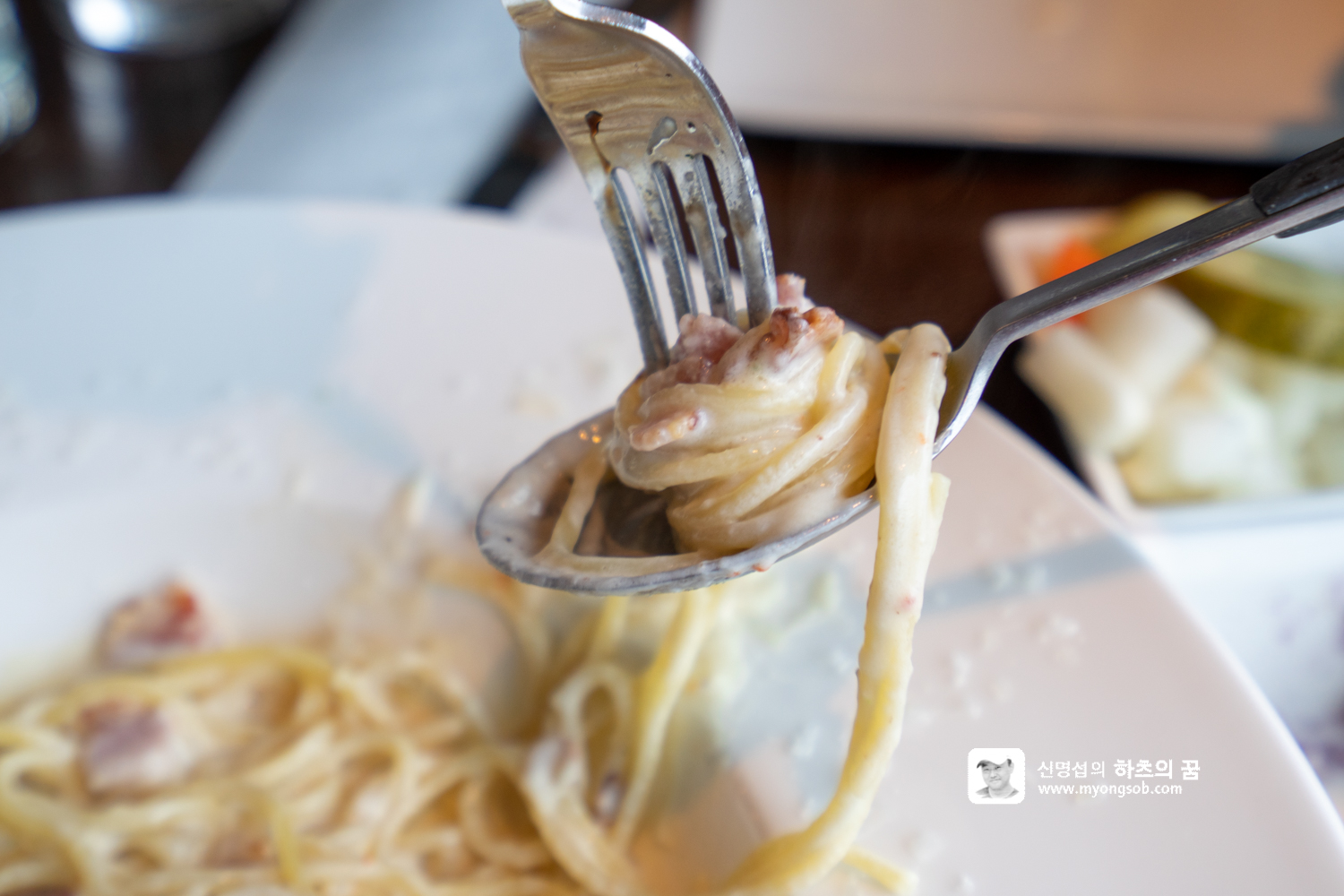 까르보나라 파스타에는 고기가 너무 많이 들어 있어서 놀랐다. 양도 꽤 많아서 둘이 함께 먹기에 충분했다.