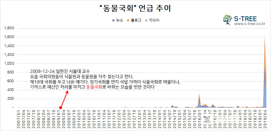 2004년 1월부터 뉴스,블로그,지식인 채널의 글을 살펴보니 정확하게 '동물국회'라고 언급한 글은 2007년 8월 21일 모 블로그의 번역문에서 '동물국회'가 등장한다.(바로가기) 하지만, 지금의 동물국회와는 의미가 다르다.